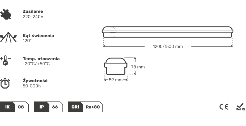 | LA015HL (120 cm) | 40W | 180lm/W | 6480lm | 4000K | 1.70kg |